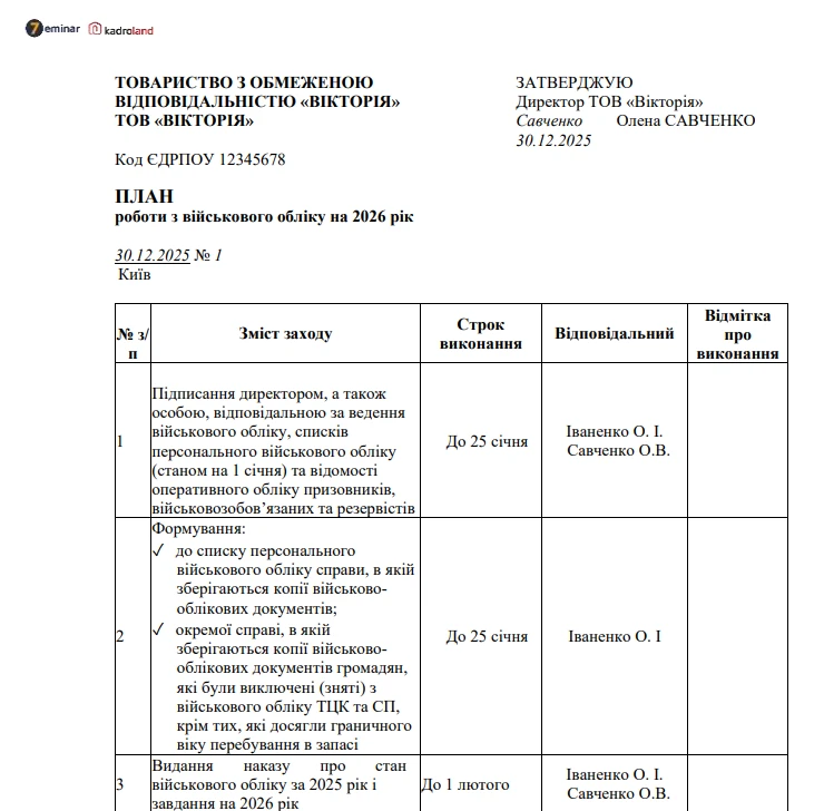 Наступний документ, який може запитувати ТЦК, – план роботи з військового обліку на 2026 рік. Про такий документ не згадується у Порядку №1487, але іноді згадують ТЦК. Якщо вам простіше зробити, ніж доводити щось, то ось вам зразок такого плану.