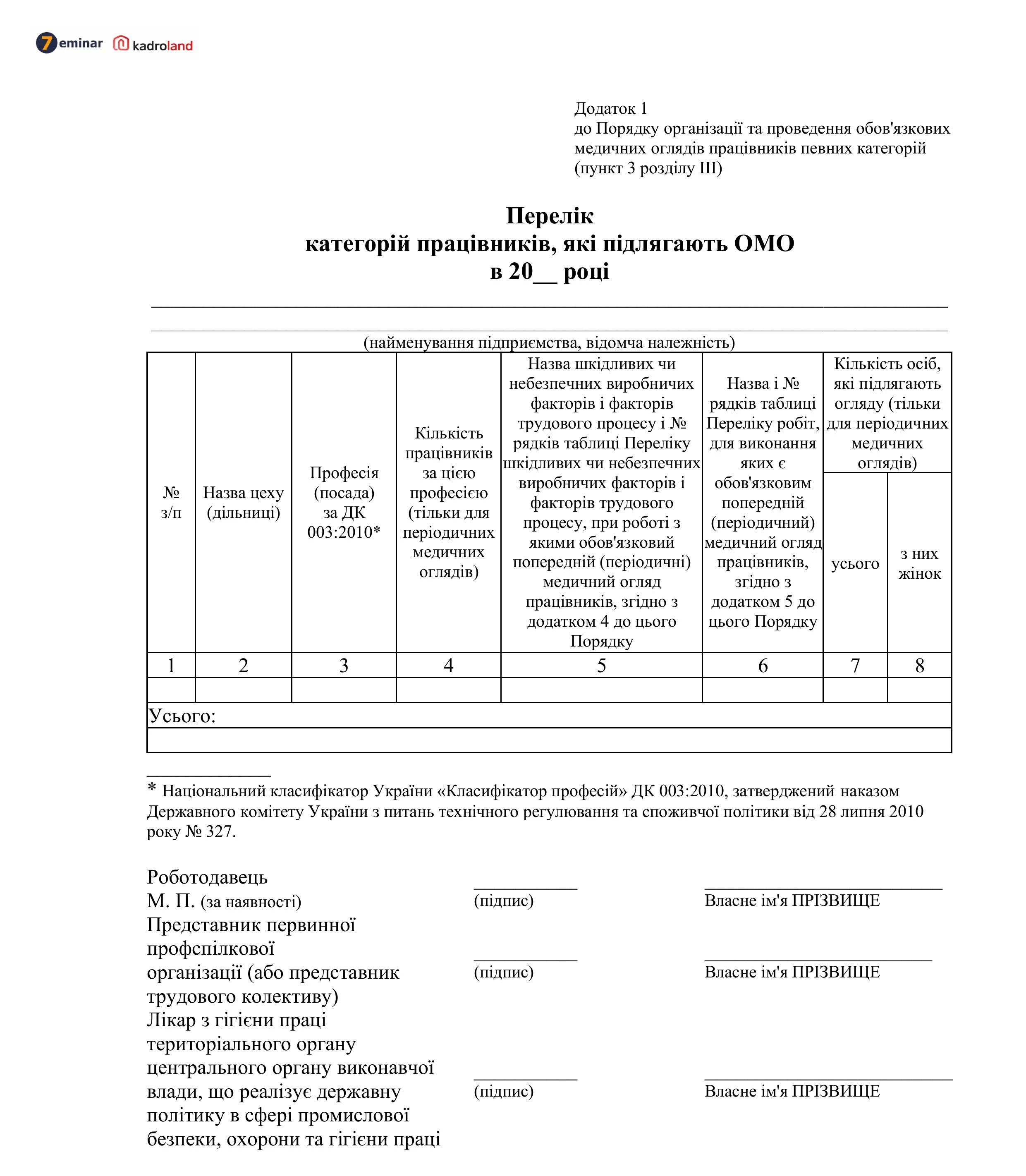 Для організації ОМО на наступний рік роботодавець до 01 грудня поточного року складає та в місячний строк погоджує з лікарем з гігієни праці територіального органу Держпраці перелік категорій працівників, які підлягають ОМО (далі - Перелік) за формою, наведеною у додатку 1 до цього Порядку
