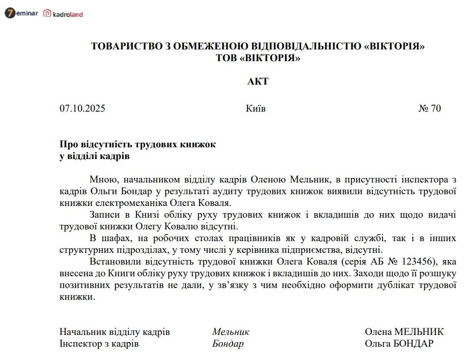 📄 Акт про відсутність трудових книжок у відділі кадрів