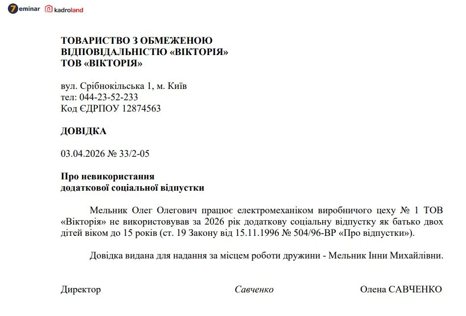 📄 Довідка з місця роботи батька про те, що він не користувався правом на додаткову соціальну відпустку