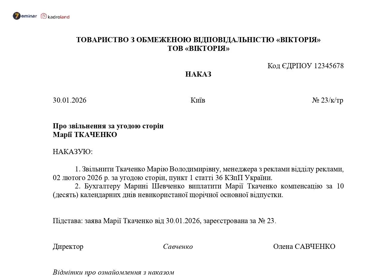 Наказ про звільнення за угодою сторін з виплатою компенсації за основну і додаткову відпустки