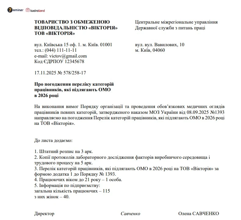 Для організації медичних оглядів на наступний рік роботодавець до 01 грудня поточного року складає та в місячний строк погоджує з лікарем з гігієни праці територіального органу Держпраці Перелік категорій працівників, які підлягають обов’язковим медичним оглядам за формою відповідно до додатка 1 до Порядку №1393.