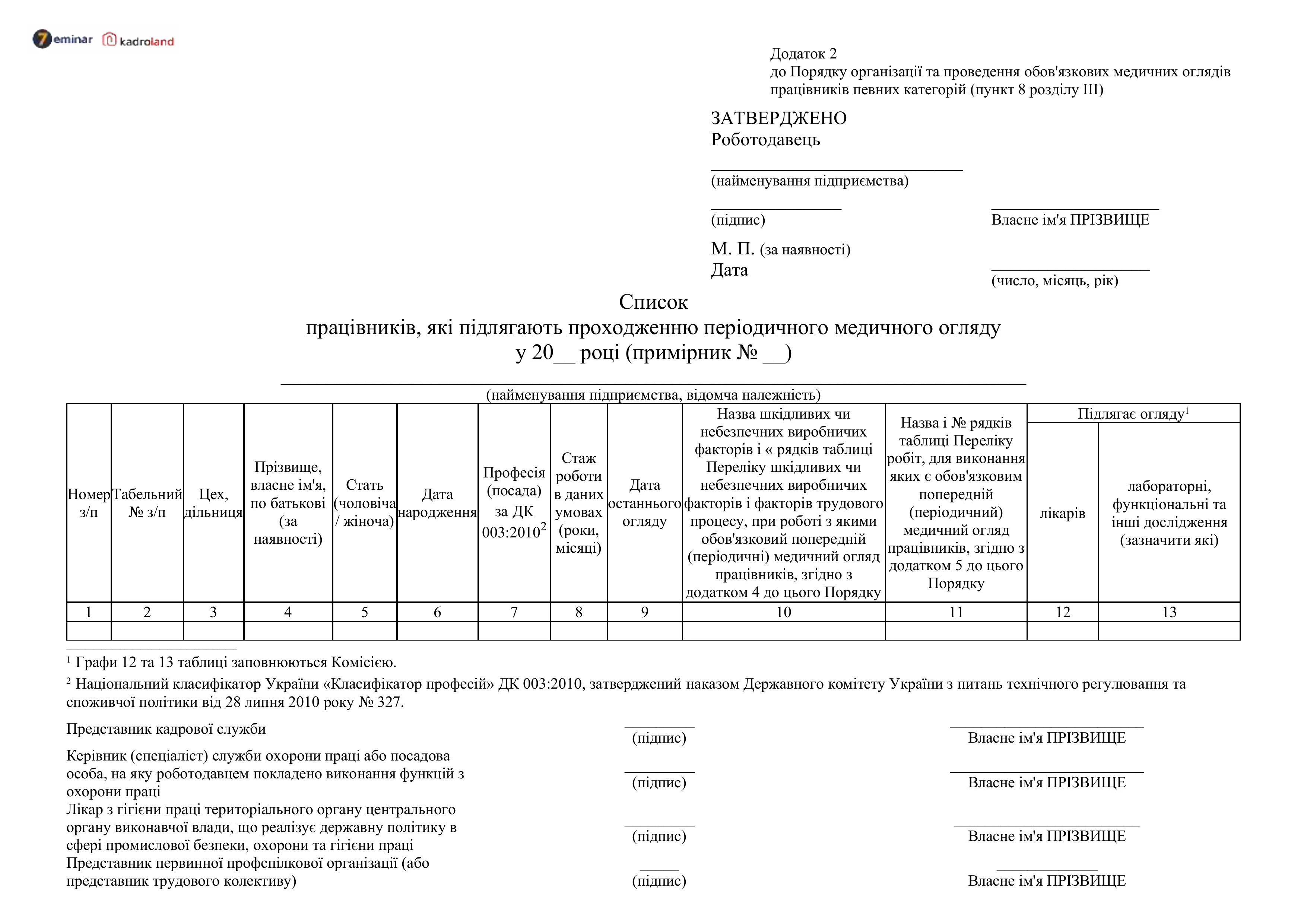 Роботодавець протягом місяця з дати складення Переліку на його підставі складає та в місячний строк погоджує з первинною профспілковою організацією підприємства, установи, організації або представником трудового колективу, якщо профспілка не створювалася, з лікарем з гігієни праці територіального органу Держпраці поіменний список працівників, які підлягають проходженню періодичного медичного огляду (далі – Список працівників), за формою, наведеною у додатку 2 до Порядку.