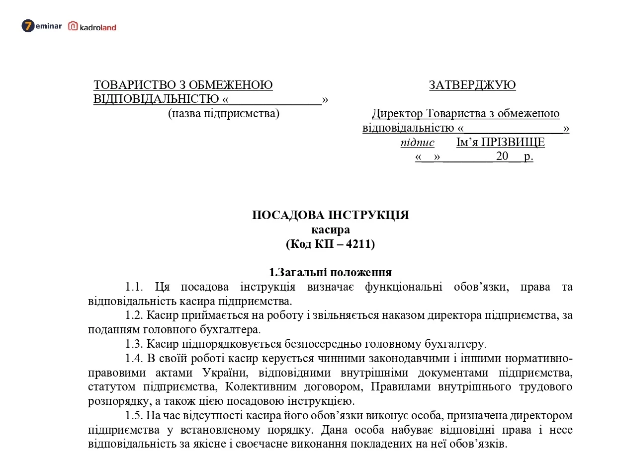 Ви можете використовувати наш зразок за основу при складанні посадової інструкції касира, доповнюючи його необхідною інформацією у разі потреби.