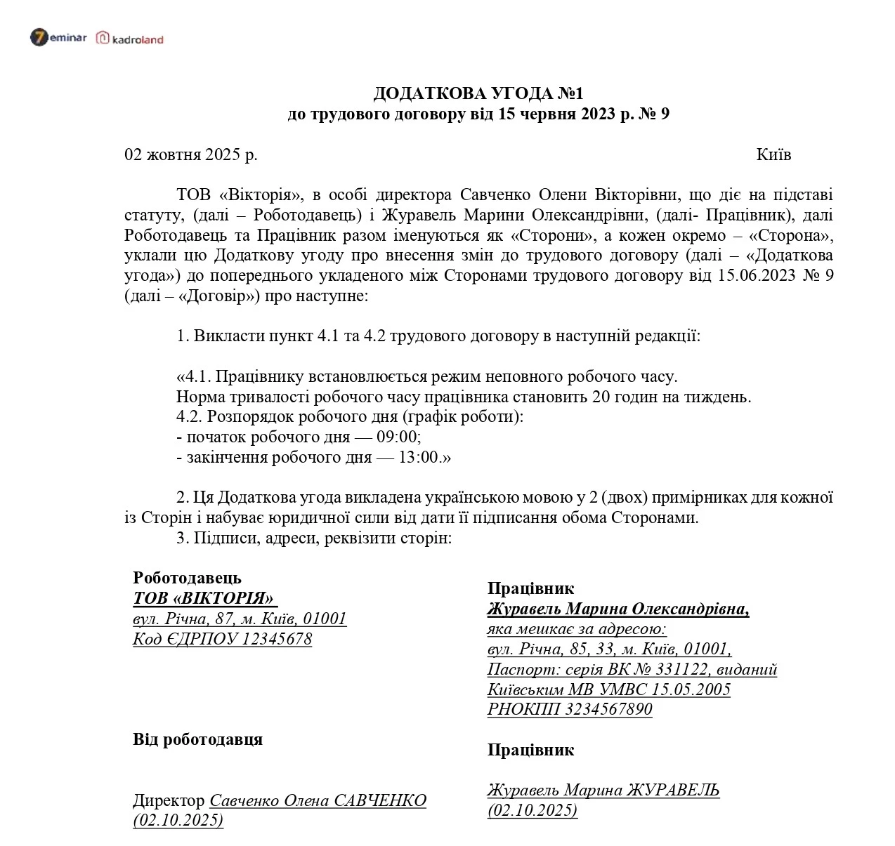 Додаткова угода про внесення змін до трудового договору (встановлення неповного робочого часу)