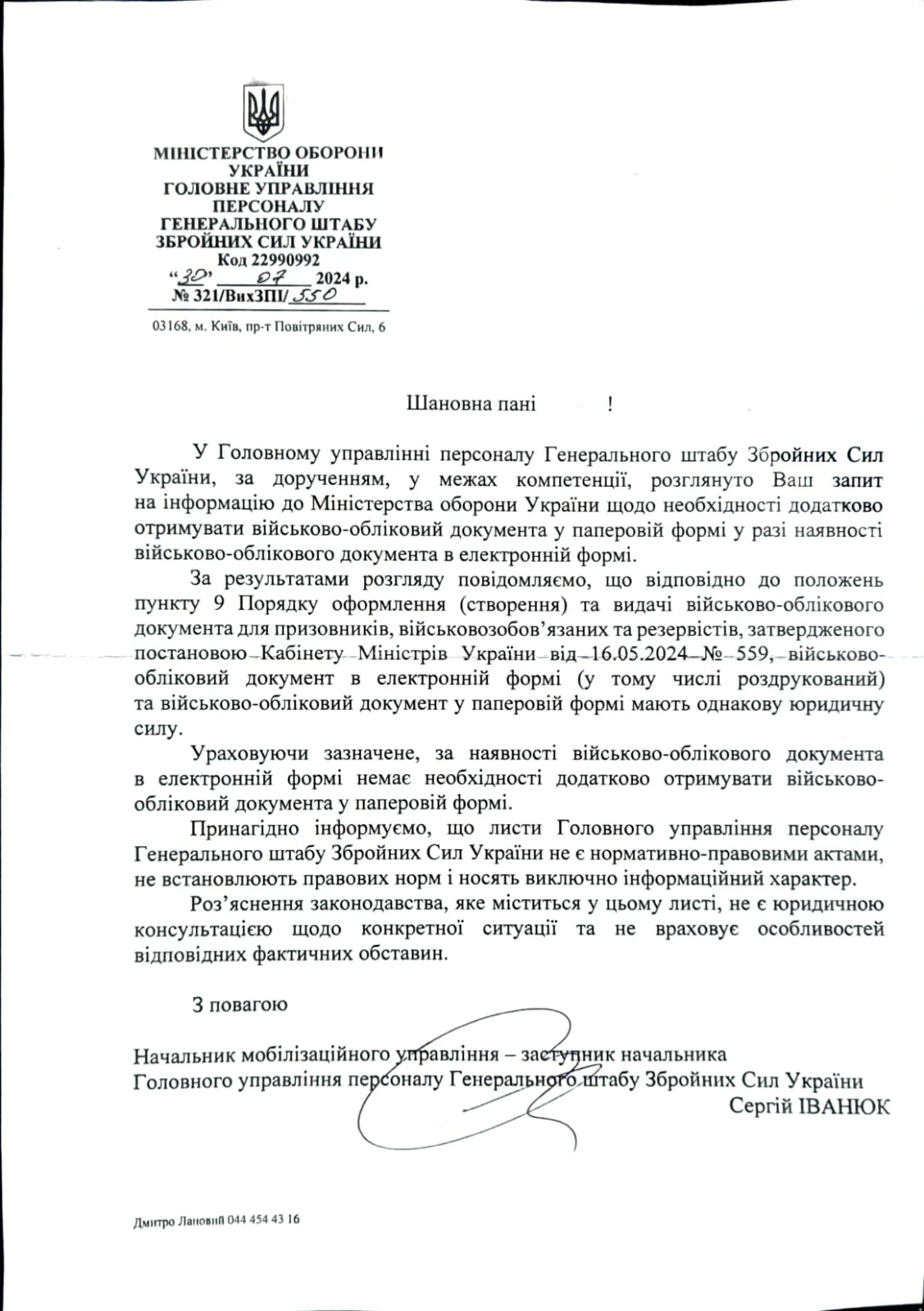 Почнемо з п. 9 Порядку оформлення (створення) та видачі військово-облікового документа для призовників, військовозобов’язаних та резервістів і форми такого документа, затвердженого постановою КМУ від 16.05.2024 №559. Саме тут Кабмін затвердив нові форми військово-облікових документів і чітко визначив, що електронний військово-обліковий документ, в тому числі його роздруківка, мають таку ж юридичну силу, як і паперовий документ.