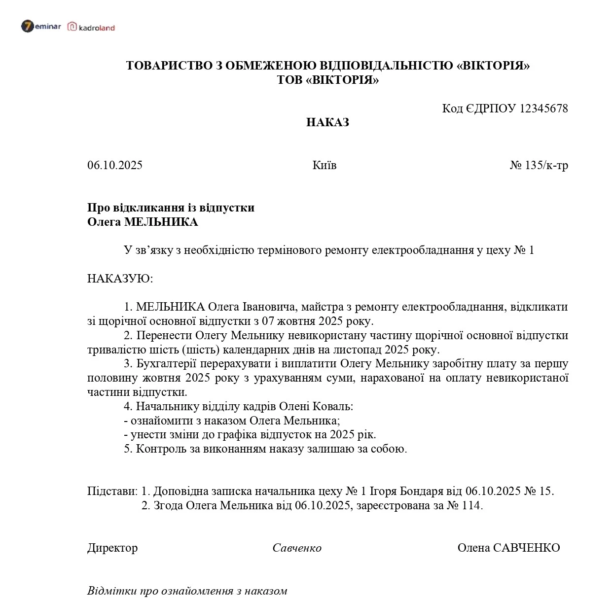 Зразок наказу про відкликання із відпустки