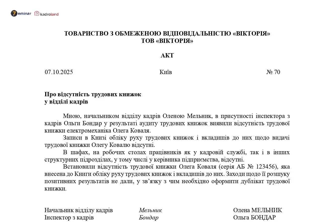 Отже, у разі втрати трудової книжки, потрібно скласти акт в якому описати факт нестачі трудової книжки із зазначенням причин та зафіксувати потребу оформлення її дублікату.