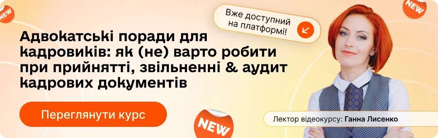Якщо хочете забути про постійний стрес, ризик судових позовів та штрафів та впевнено вести кадровий облік, у нас є рішення. Практичний відеокурс «Адвокатські поради для кадровиків: як (не) варто робити при прийнятті, звільненні & аудит кадрових документів» допоможе вам розібратися з усіма тонкощами, навчить уникати типових помилок та діяти законно і безпечно.