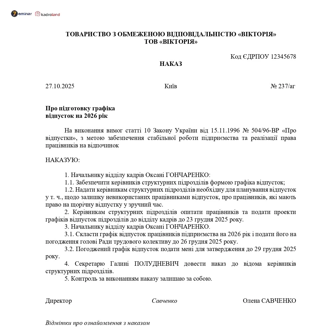 Перш ніж складати графіка відпусток доцільно видати наказ про підготовку графіка відпусток, щоб закріпити обов'язок складання проєкту графіку за конкретними працівниками та узгодити строки надання щорічних відпусток.