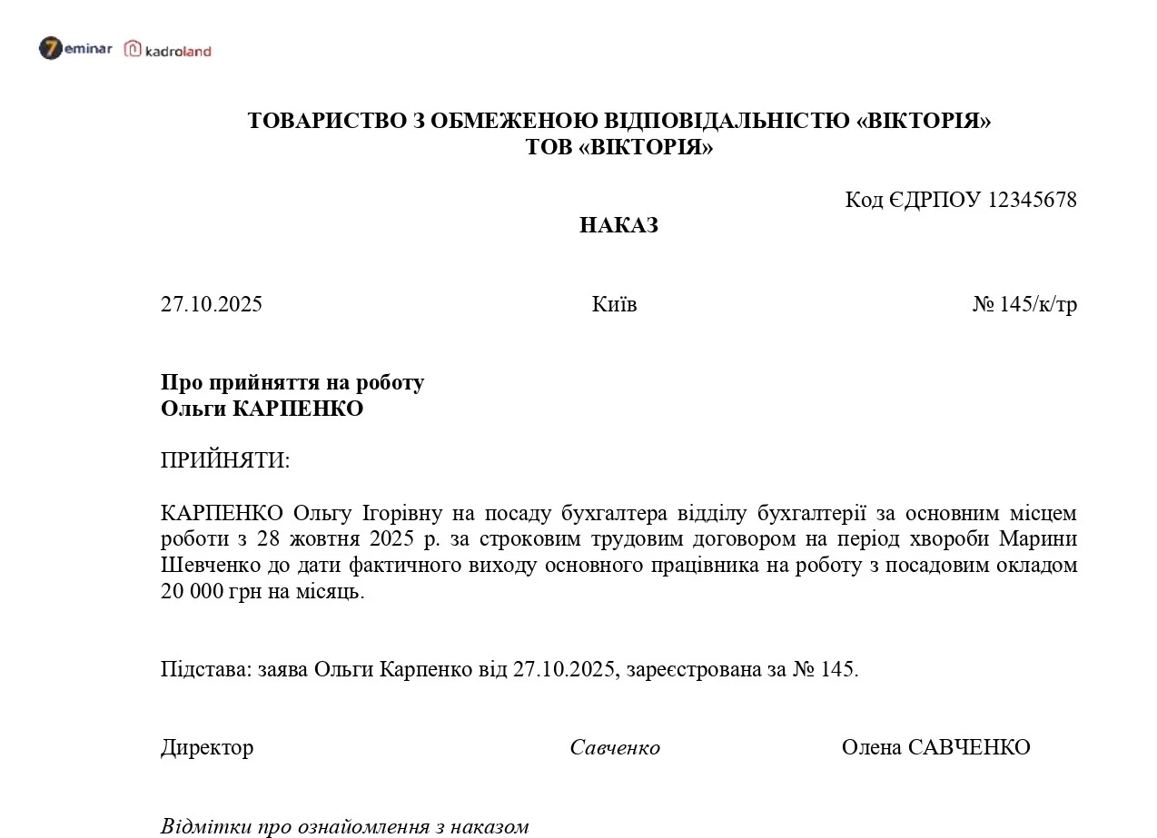 Наказ про прийняття на роботу за строковим трудовим договором на період хвороби основного працівника