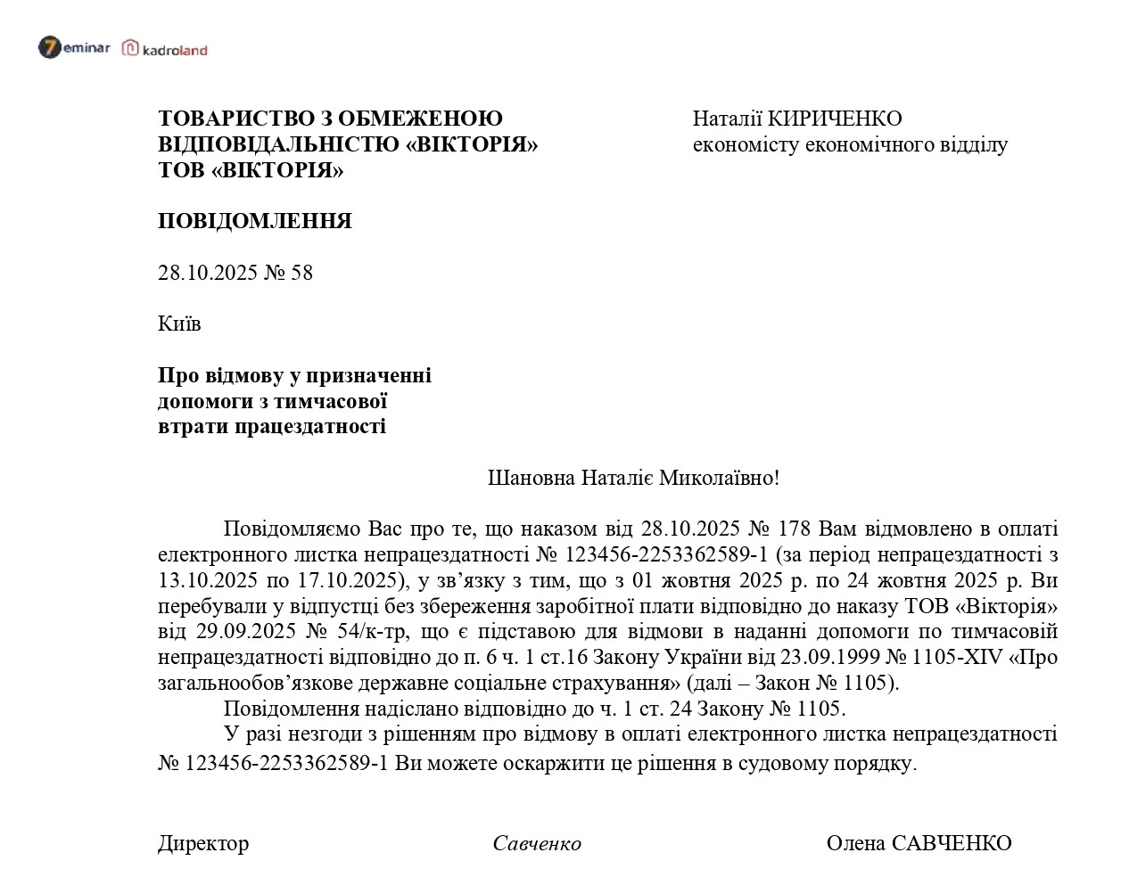 Зразок повідомлення про відмову у призначенні допомоги з тимчасової