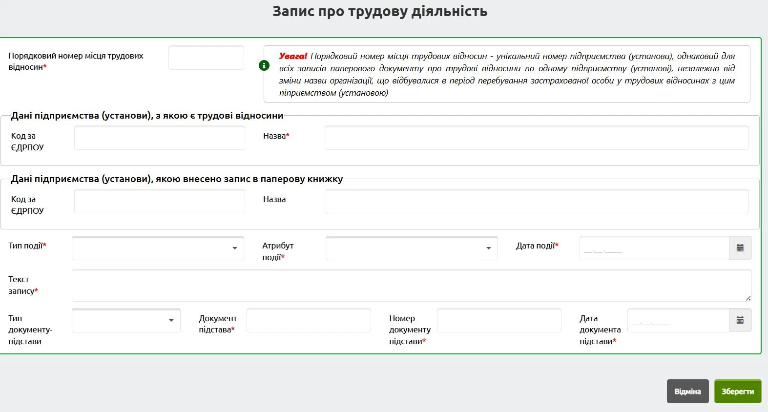 І по кожному запису в паперовій трудові книжці окремо заповнюємо наступне вікно. Принцип такий: внесли дані про запис, натиснули «Зберегти». І так кожен запис. Зауважте, що внести записи слід всі одразу. Не передбачено можливості зберегти і потім продовжити.
