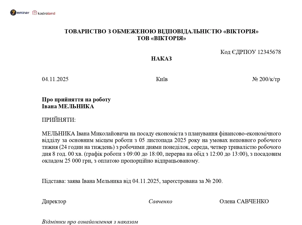 Наказ про прийняття за основним місцем роботи на умовах неповного робочого тижня