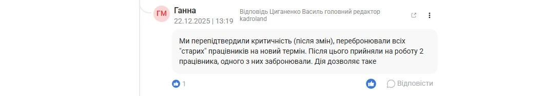 Доповнення від редакції: Побоювання не справдилися. Як повідомляють наші читачі у коментарях під цим матеріалом, у схожій ситуації підприємство змогло забронювати додатково працівників (див. малюнок).