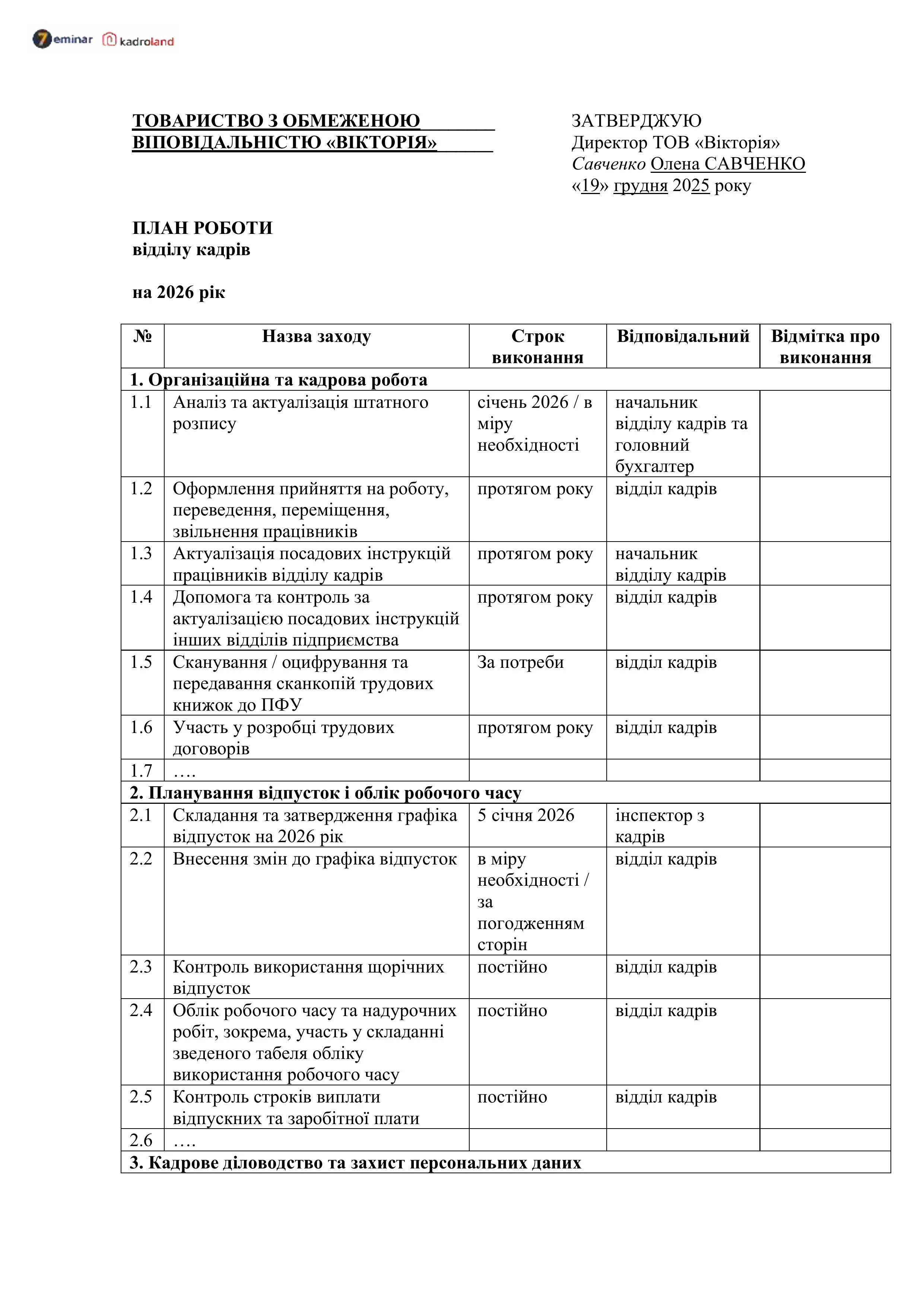- Практичний зразок плану роботи відділу кадрів на 2026 рік