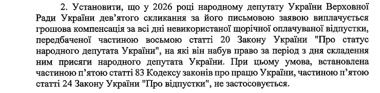 У 2026 році народним депутатам Верховної Ради дев'ятого скликання за письмовою заявою виплатять грошову компенсацію за всі дні невикористаної щорічної оплачуваної відпустки, передбаченої частиною восьмою статті 20 Закону України від 17.11.1992 №2790-XII «Про статус народного депутата України» (далі – Закон №2790), на які він набув право за період з дня складення ним присяги народного депутата України.