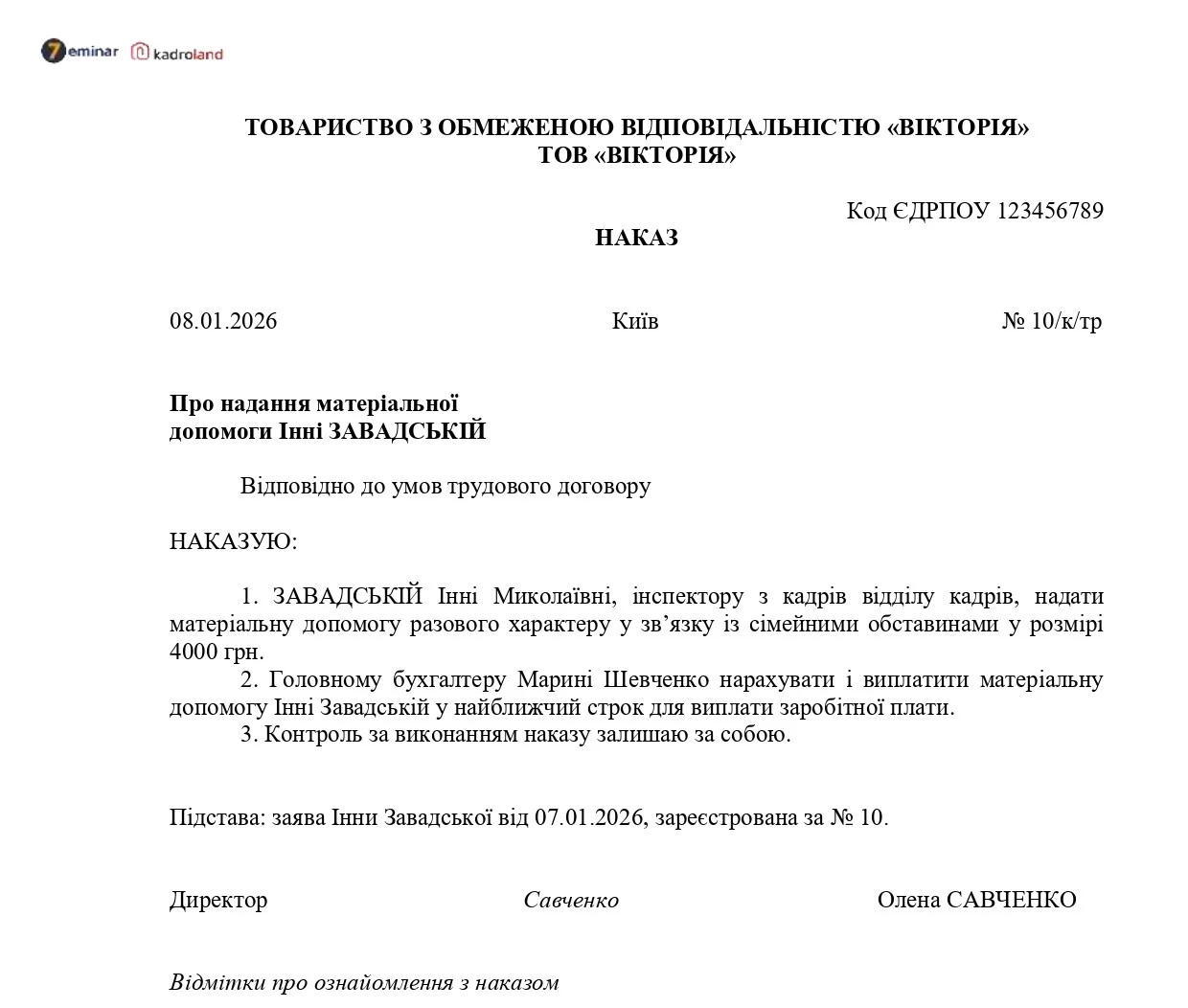 Наказ про надання матеріальної допомоги у зв'язку із сімейними обставинами