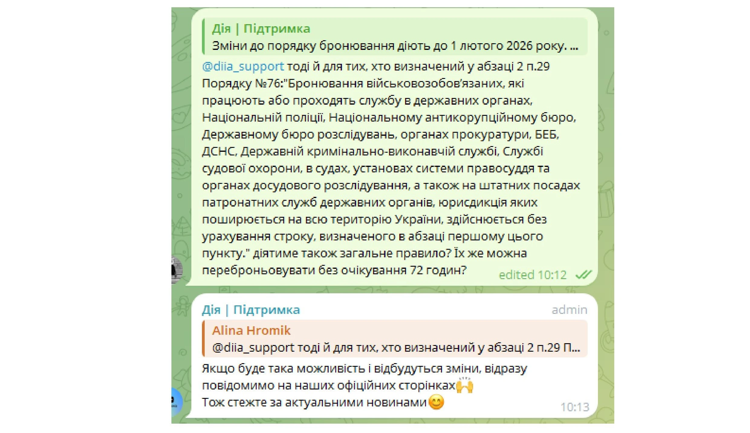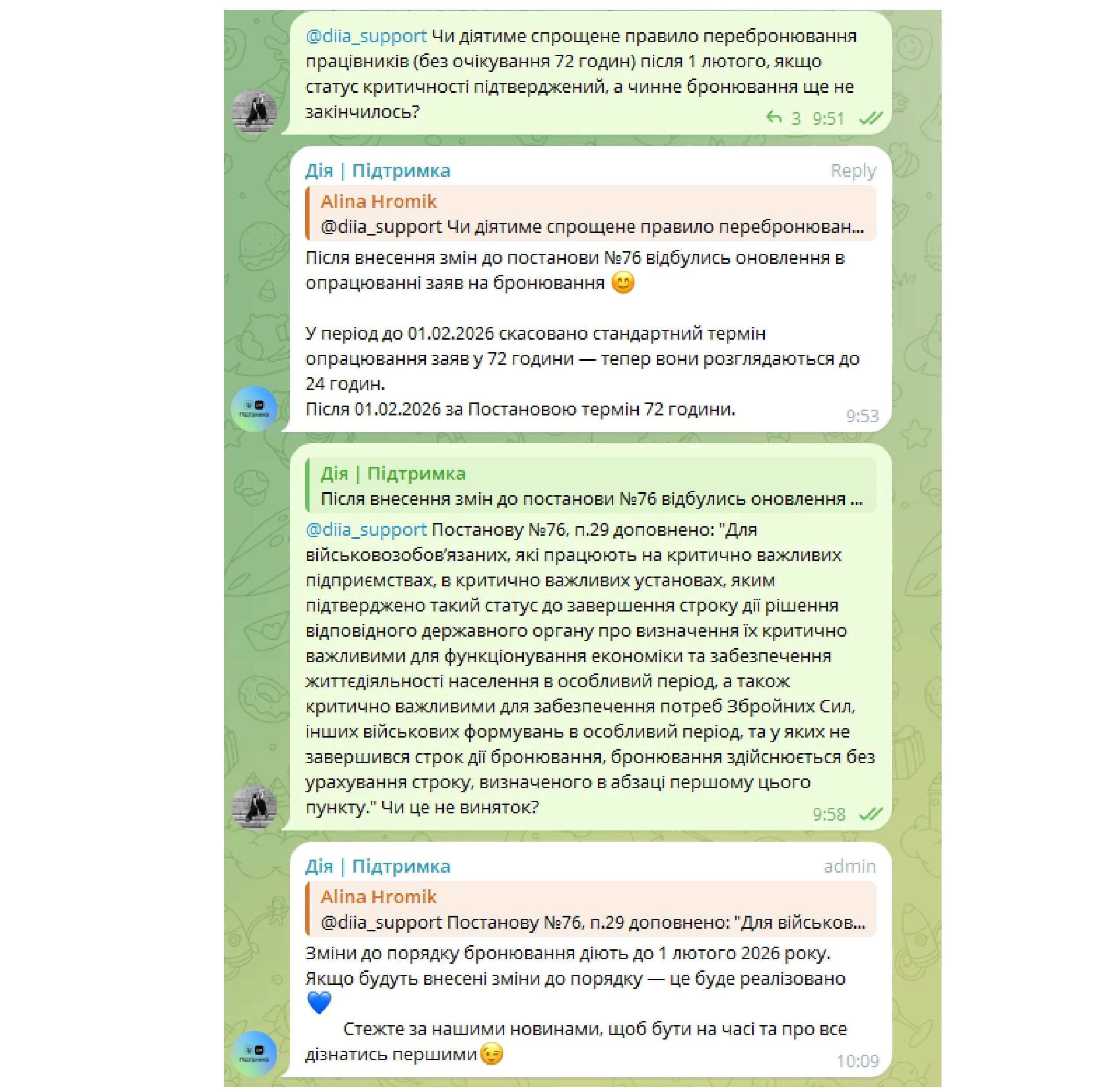 Однак чи буде на практиці реалізовано таке перебронювання у «Дії» – питання. Так у підтримці говорять, що після 01.02.2026 діятиме загальне правило для всіх – «72 години» (див. скриншоти нижче).