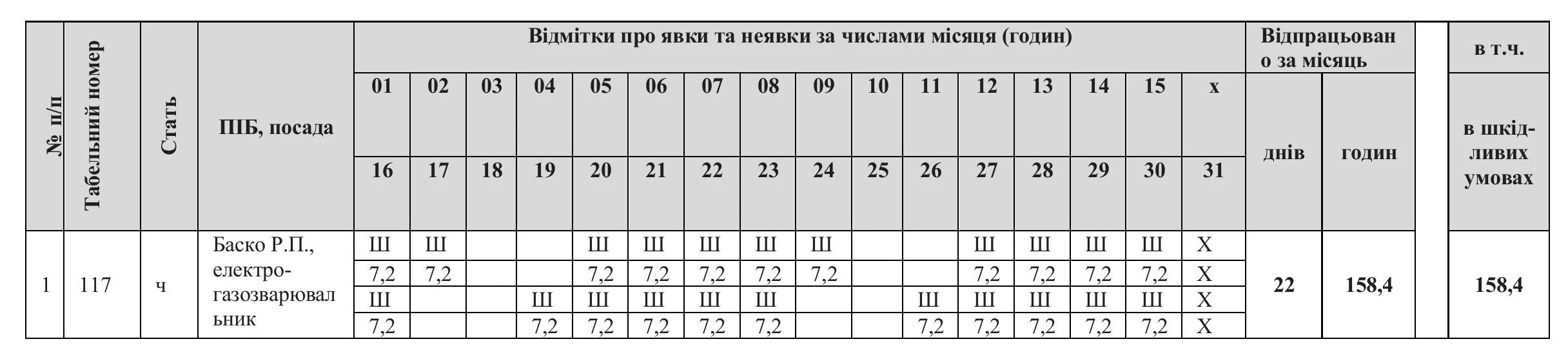 Якщо лише частину робочої зміни — окремо відображають години, відпрацьовані в шкідливих та нормальних умовах. Наприклад, Ш/Р та 5/2,2 означатиме робота у шкідливих умовах 5 год та робота у звичайних умовах 2,2 години.