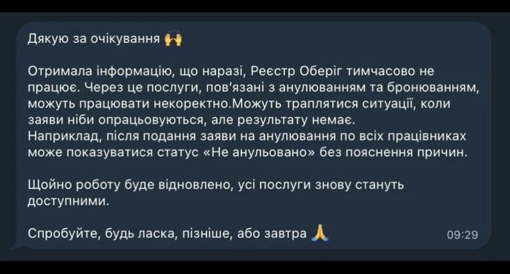 Наразі стало відомо (див. скриншот нижче), що причиною збоїв є тимчасові складнощі у роботі Реєстру «Оберіг» і через це послуги, пов’язані з анулюванням та бронюванням можуть працювати некоректно. У «Дії» радять скористатися згаданими послугами пізніше.