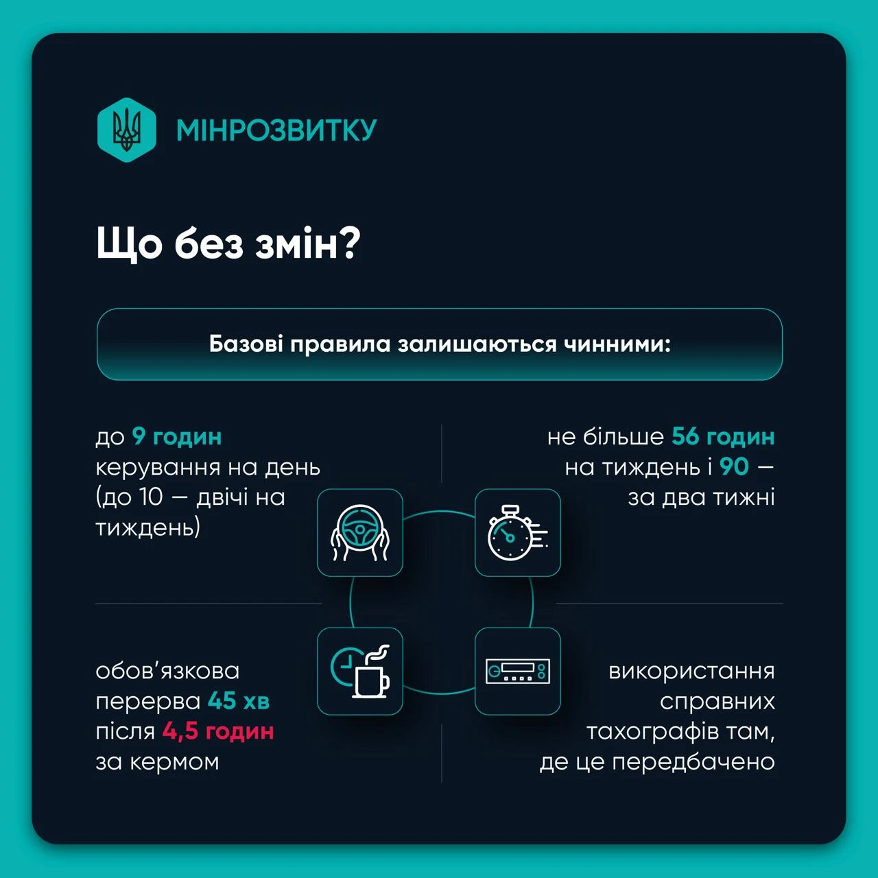 - чіткі норми керування та відпочинку (9 год/день, 56 год/тиждень, перерва після 4,5 год);