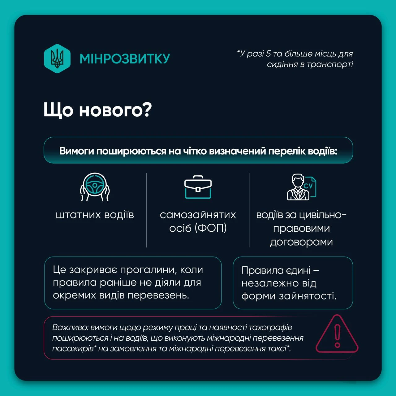 - правила поширюються не лише на штатних водіїв, а й на ФОПів та водіїв за цивільно-правовими договорами, зокрема й тих, хто виконують міжнародні перевезення пасажирів на замовлення чи міжнародні перевезення таксі;