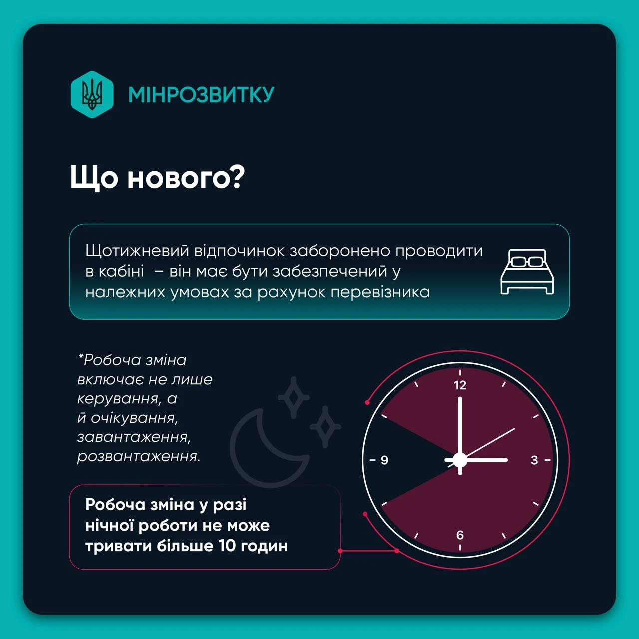 - нічна зміна (22:00–06:00) – може тривати не більше 10 годин, тут важливо розрізняти поняття «робоча зміна» та «час керування»;