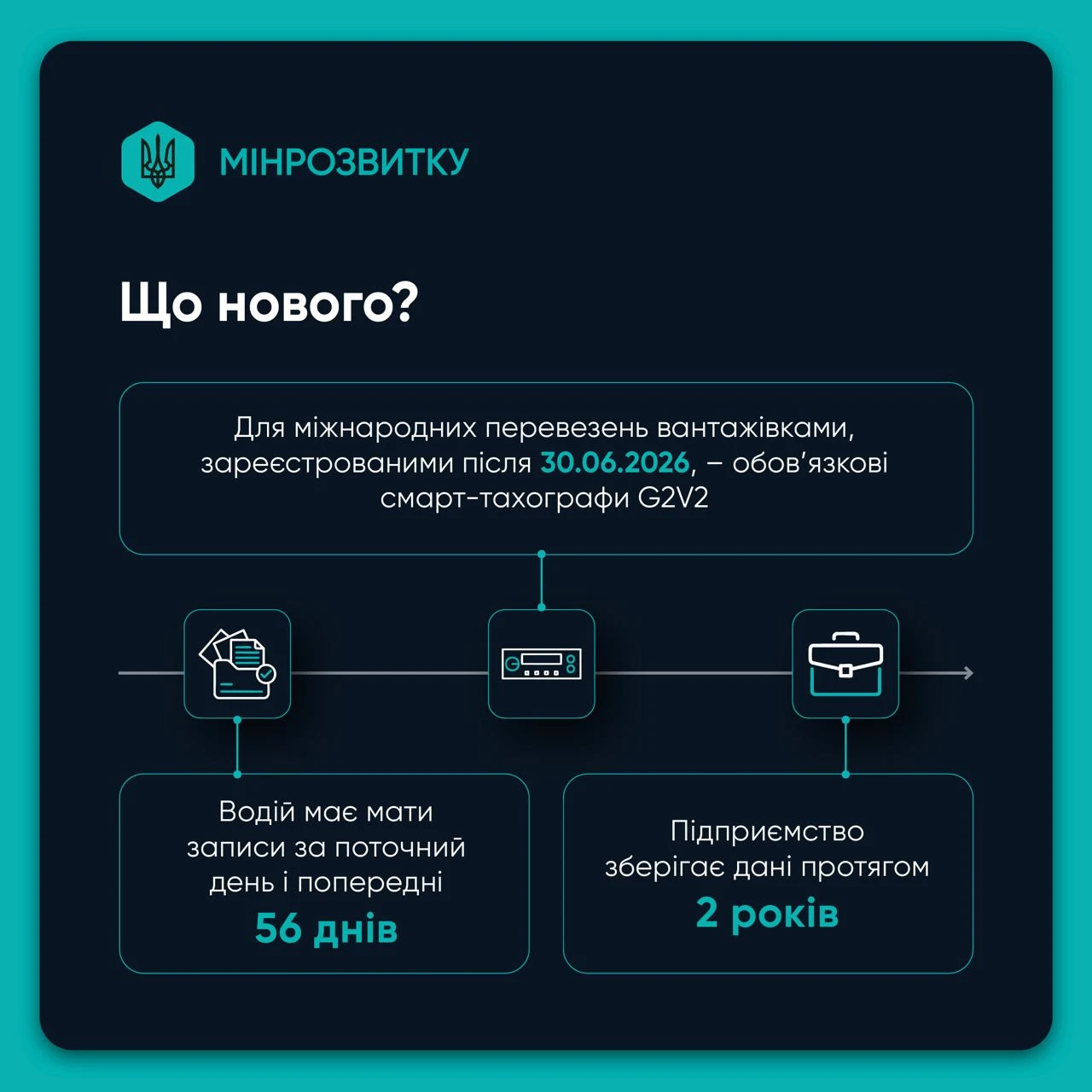 - для міжнародних перевезень вантажівками, зареєстрованими після 30 червня 2026 року, – обовʼязкові смарт-тахографи G2V2;