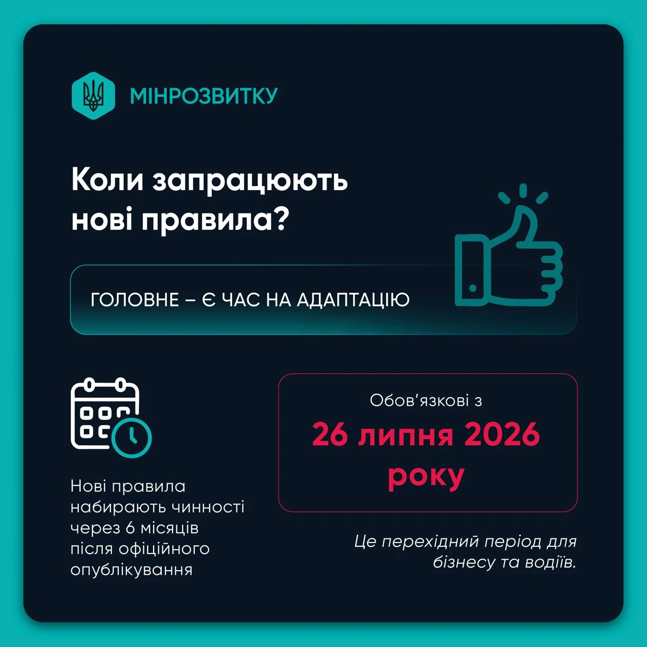 Нові правила стають обовʼязковими через 6 місяців після офіційного опублікування – з 26 липня 2026 року. Це дає бізнесу і водіям час на адаптацію.