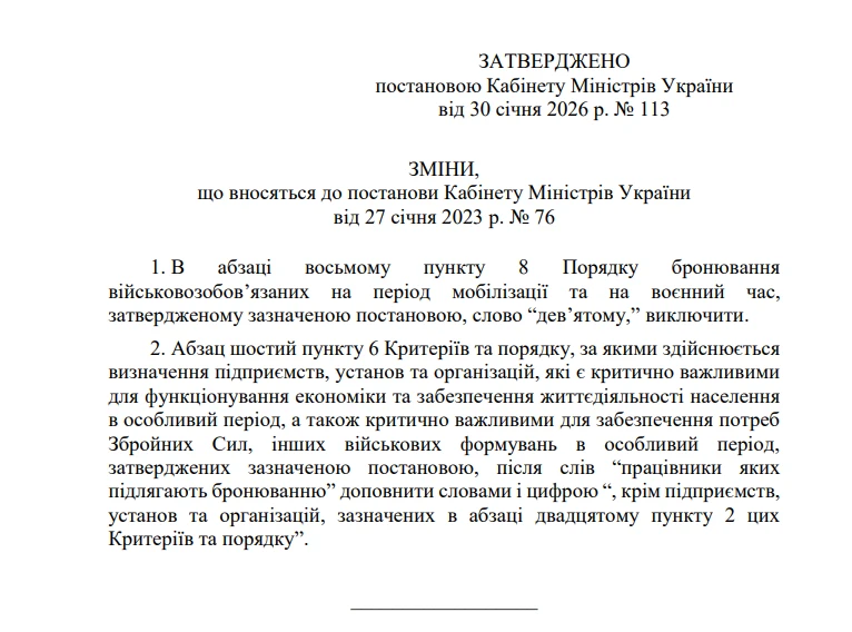 Кабінет Міністрів України підтримав ініціативу Міністерства оборони та ухвалив зміни до Порядку бронювання військовозобов’язаних на період мобілізації та на воєнний час, затвердженого постановою КМУ від 27.01.2023 №76, який регулює питання бронювання військовозобов’язаних під час воєнного стану. Зокрема, постановою КМУ від 30.01.2026 №113 «Про внесення змін до постанови Кабінету Міністрів України від 27 січня 2023 р. № 76» внесено такі зміни: