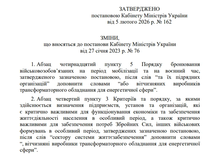 Своєю постановою від 05.02.2026 №162 «Про внесення змін до постанови Кабінету Міністрів України від 27 січня 2023 р. № 76» Уряд ухвалив важливе рішення для виробників трансформаторного обладнання.