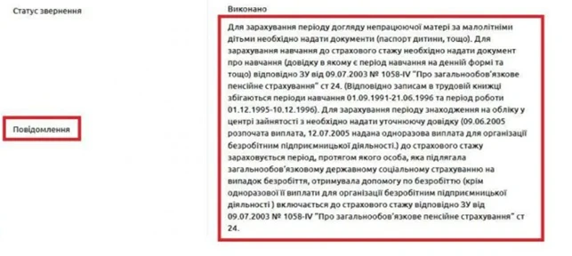 Статус звернення «Виконано» свідчить, що сканкопії опрацьовані та дані про трудові відносини працівника актуалізовано. Однак перевірте наявність зауважень в реквізиті «Повідомлення».