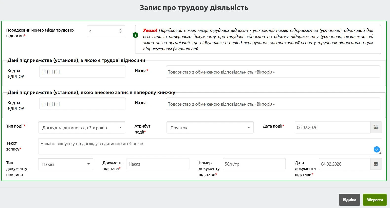 Якщо оцифровуємо свій наказ, то дані полів «Дані підприємства (установи), з якою є трудові відносини» і «Дані підприємства (установи), якою внесено запис в паперову книжку» збігатимуться. Якщо оцифровуємо «чужий» наказ, то в полі «Дані підприємства (установи), якою внесено запис в паперову книжку» зазначаємо дані такого страхувальника.
