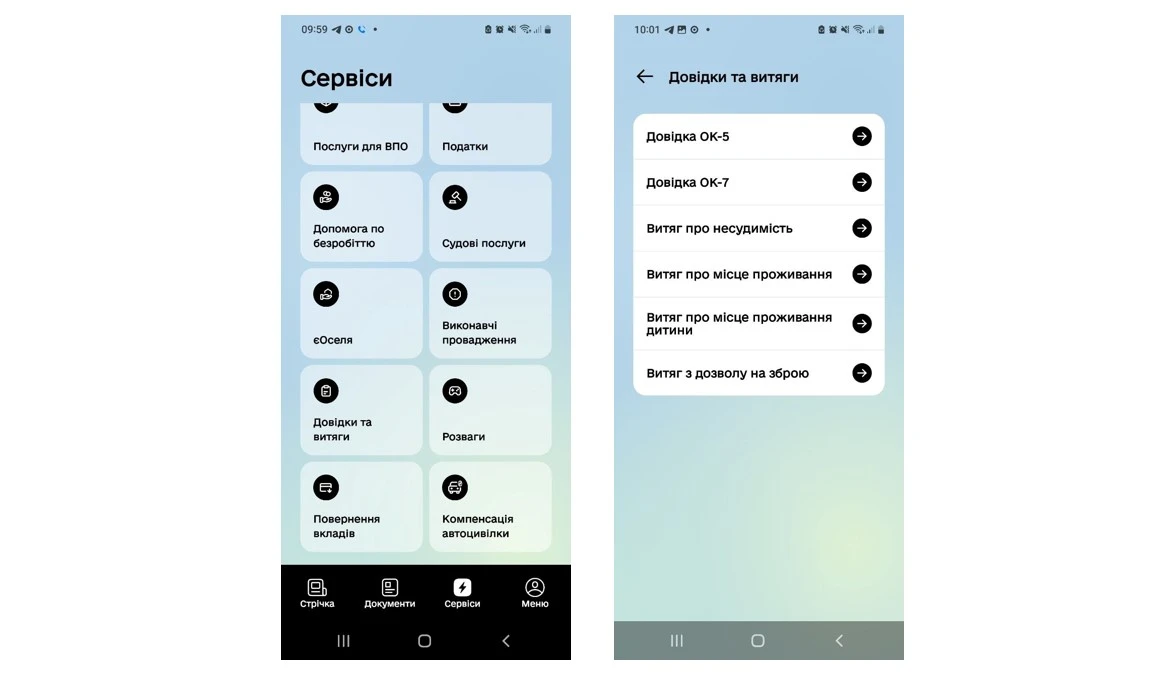 - Заходимо у застосунок і обираємо опцію «Сервіси» → «Довідки та витяги».
