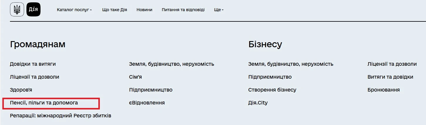 В «Каталозі послуг» обираємо розділ «Пенсії, пільги та допомога».