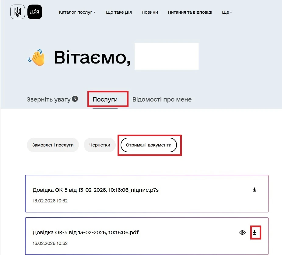 В розділі «Послуги» у вкладці «Отримані документи» буде знаходитись готова довідка.