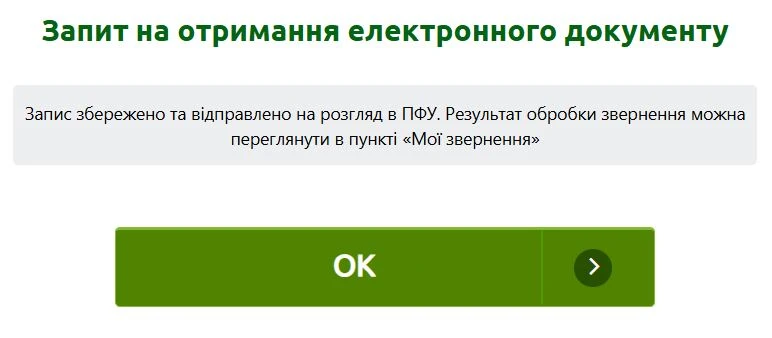 Заповнюємо особисті дані, проставляємо галочку «згоди на обробку персональних даних» і натискаємо «Відправити до ПФУ». Отримуємо ось таке повідомлення: