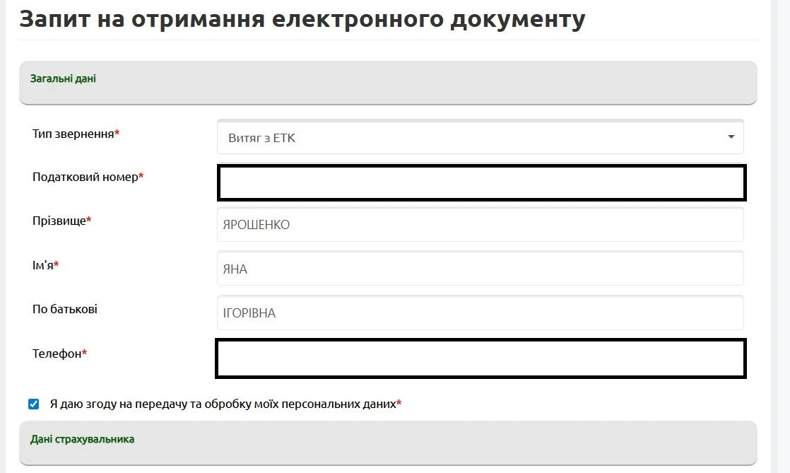 Далі у розділі «Комунікації з ПФУ» обираєте вкладку «Запит на отримання електронних документів». Персональні дані підтягуються автоматично. Обираємо тип звернення «Витяг з ЕТК». Проставляємо «згоду на обробку персональних даних» і надсилаємо запит до Пенсійного фонду.