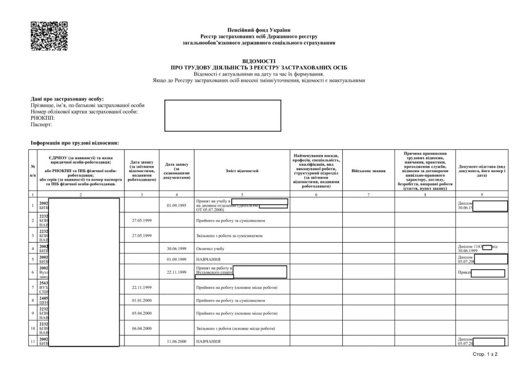 В результат формується окремий документ з назвою Відомості про трудову діяльність з реєстру застрахованих осіб.