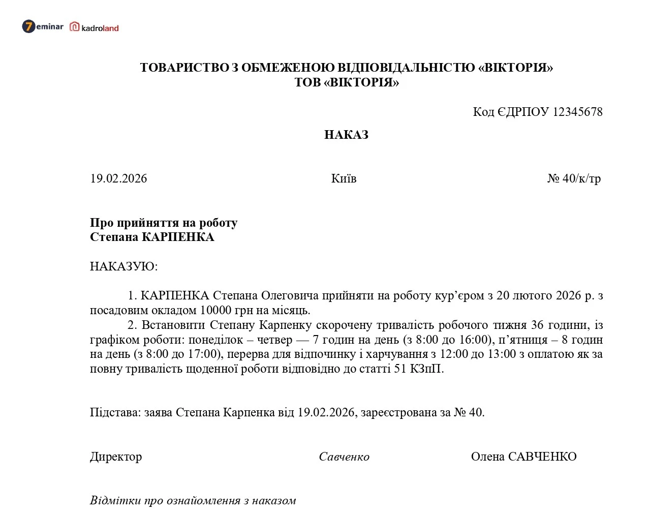 Наказ про прийняття на роботу неповнолітнього ( з 16 до 18 років)