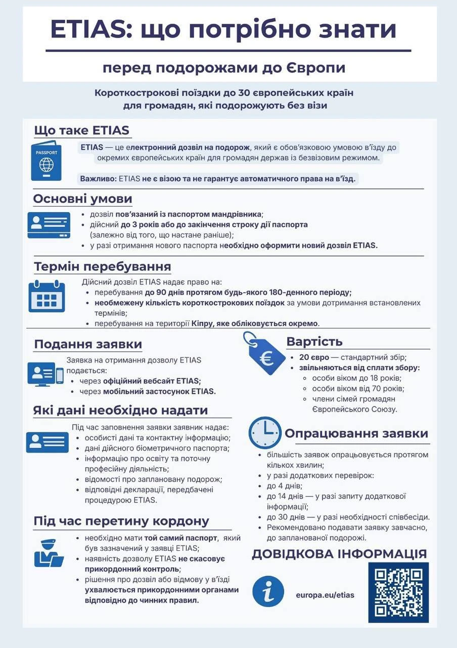 Починаючи з четвертого кварталу 2026 року громадяни країн, у тому числі громадяни України, які в’їжджають до країн Шенгенської зони без візи (на строк до 90 днів протягом 180 днів), повинні будуть мати дозвіл на в’їзд для короткострокового перебування в цих європейських країнах.