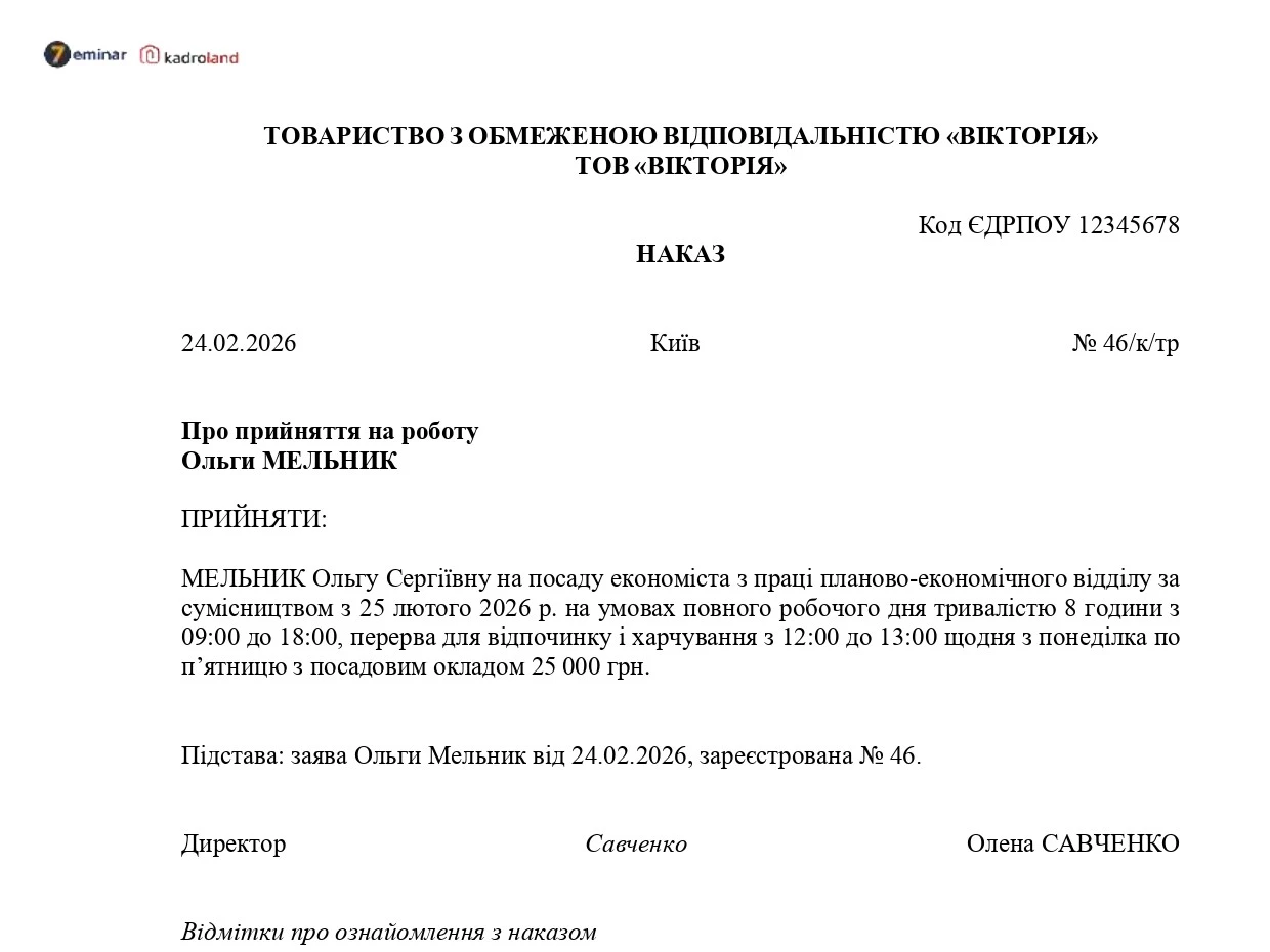 Зразок наказу про прийняття на роботу за сумісництвом