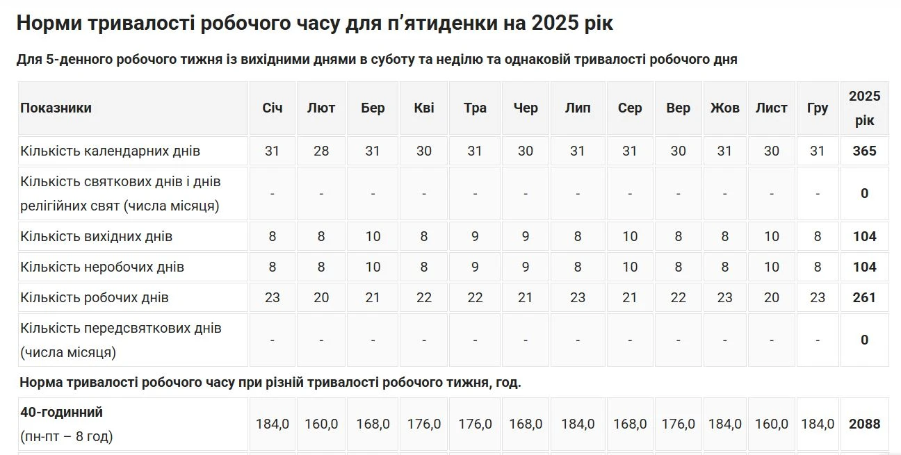 Норма тривалості робочого часу у 2025 році за п'ятиденного та шестиденного робочого тижня