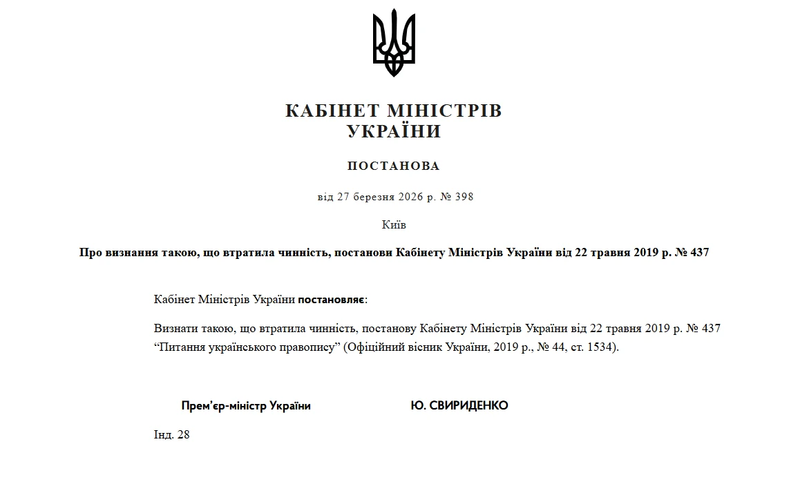 Текст Українського правопису набере чинності й буде опублікований на офіційному вебсайті Комісії одночасно з набранням чинності постанови КМУ про визнання такою, що втратила чинність, постанови Кабміну від 22.05.2019 №437 «Питання українського правопису»
