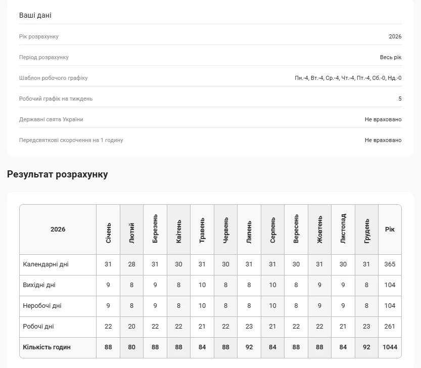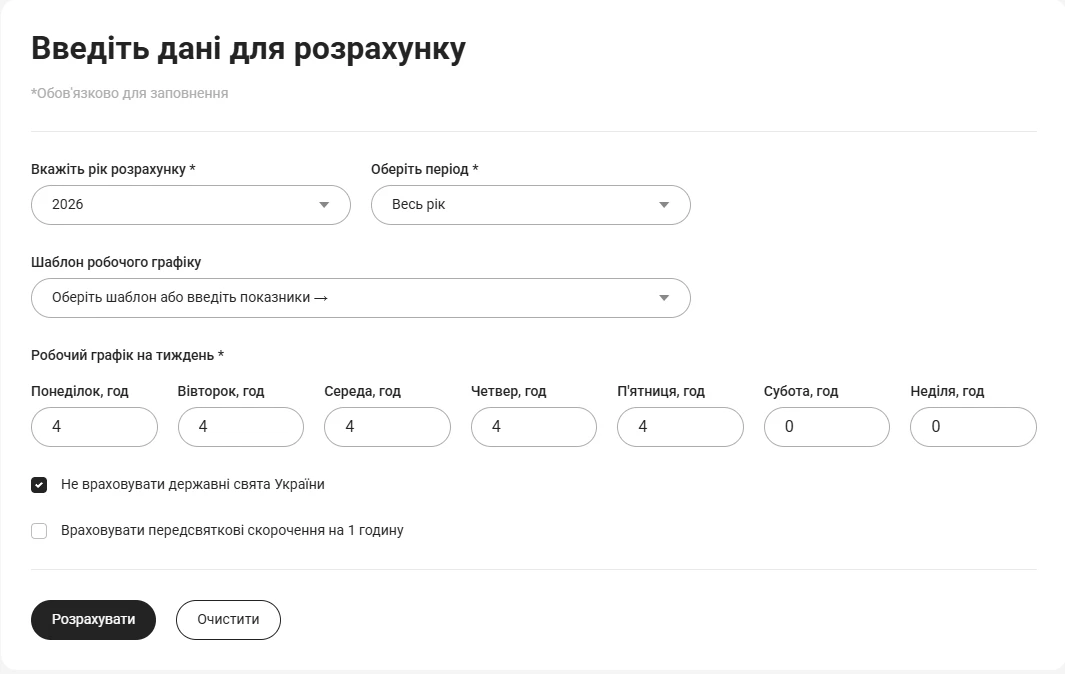 Вводимо дані у калькуляторі (розрахунок проводимо за весь 2026 рік), натискаємо позначку щодо неврахування свят.