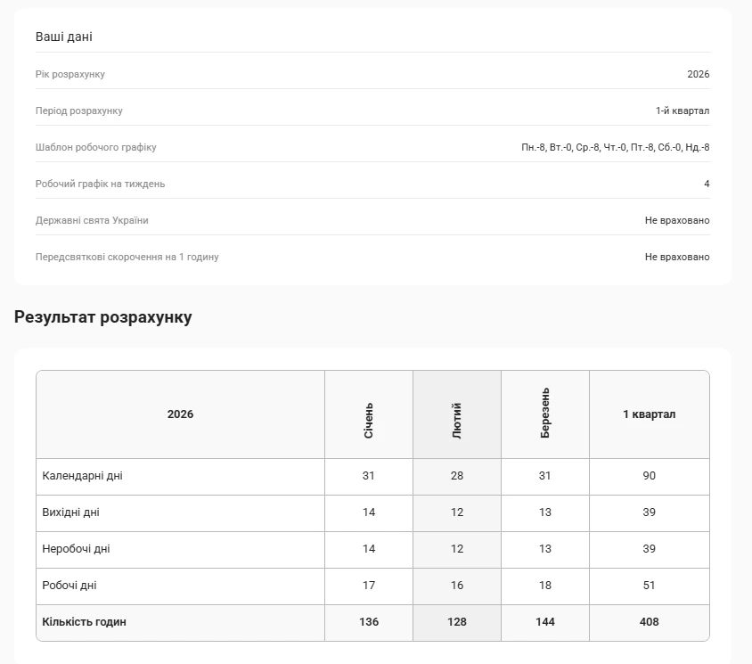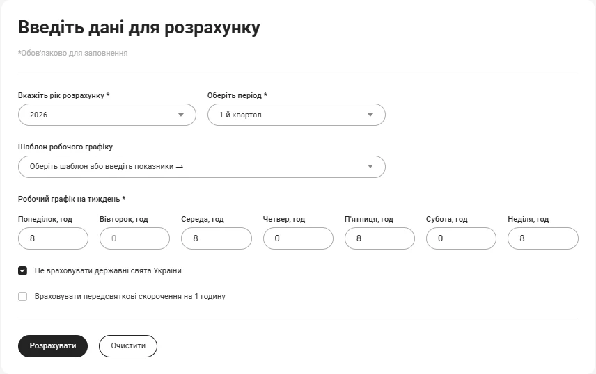 Вводимо дані у калькуляторі (тут розрахунок ми провели для І кварталу 2026 року – обрали відповідний період у калькуляторі), натискаємо позначку щодо неврахування свят.