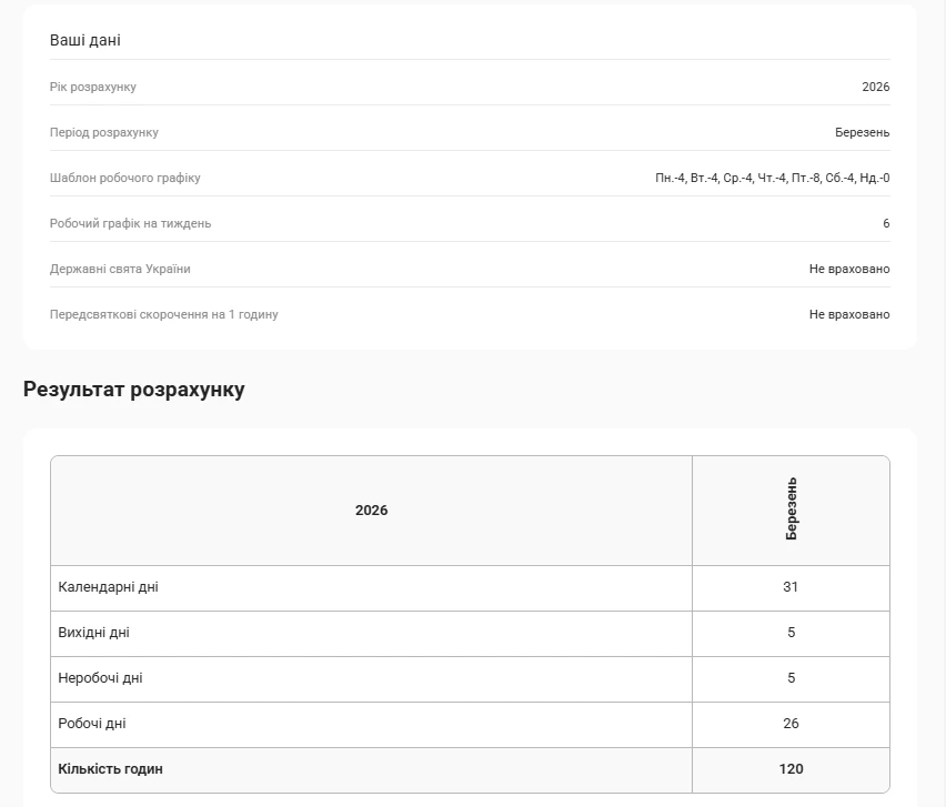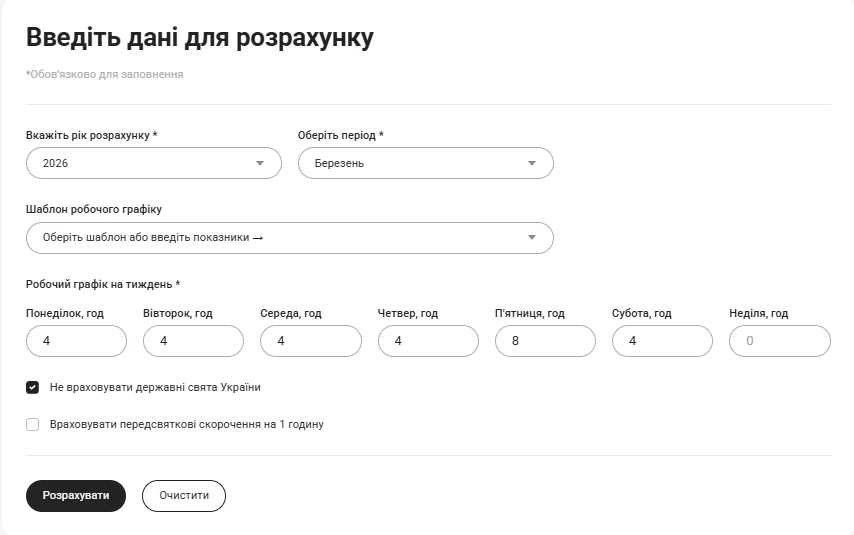 Вводимо дані у калькуляторі (тут розрахунок ми провели для березня 2026 – для цього обрали відповідний період у калькуляторі), натискаємо позначку щодо неврахування свят.