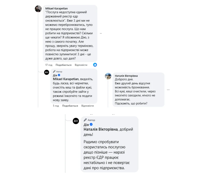 Останніми днями користувачі не можуть скористатися послугою бронювання працівників у «Дії». Під час подання заяви з’являється повідомлення: «Послуга недоступна. Єдиний державний реєстр (ЄДР) оновлюється. Повертайтесь трохи пізніше».