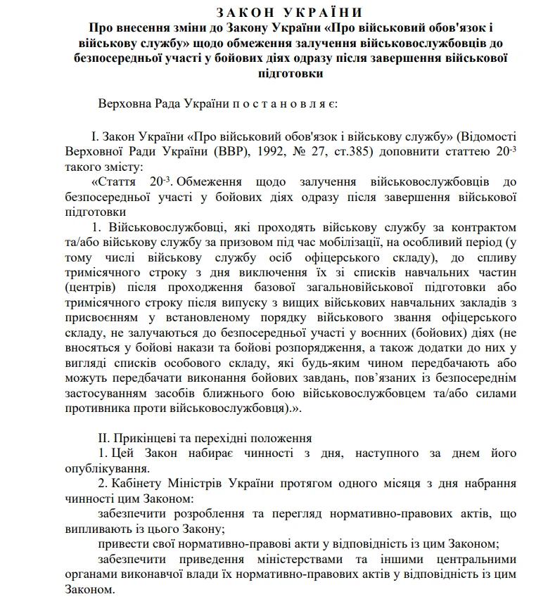 Як зазначено у пояснювальній записці законопроєкту №15086, чинне законодавство не містить положень, які б встановлювали обмеження щодо залучення військовослужбовців до безпосередньої участі у бойових діях одразу після завершення базової військової підготовки або після випуску з вищих військових навчальних закладів.